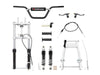 TBparts Upgraded Z50 Front fork kit. Includes everything in the picture – High Quality KLX110 style forks with Heavy Duty Springs, billet triple clamps, billet risers, longer axle, brake cable, cable bracket, and billet hub stop.